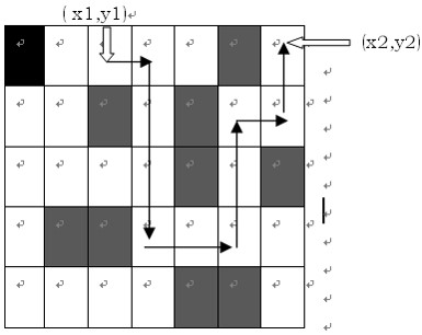 给出一张地图,这张地图被分为n×m(n,m<=100)个方块,任何一个方块不是平地就是高山。平地可以通过,高山则不能。现在你处在地图的(x1,y1)这块平地,问:你至少需要拐几个弯才能到达目的地(x2,y2)?你只能沿着水平和垂直方向的平地上行进,拐弯次数就等于行进方向的改变(从水平到垂直或从垂直到水平)的次数。例如:如图,最少的拐弯次数为5。