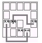 在(1,3)的牌和在(4, 4)的牌可以被连接。(2, 3)和(3, 4)不能被连接。 你的任务是编一个程序,检测两张牌是否能被一条符合以上规定的路径所连接。