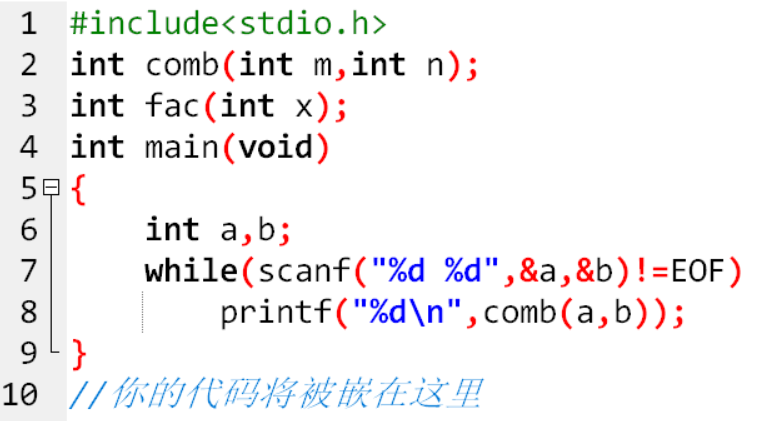 本题要求实现2个自定义函数:求组合数函数和求阶乘函数。