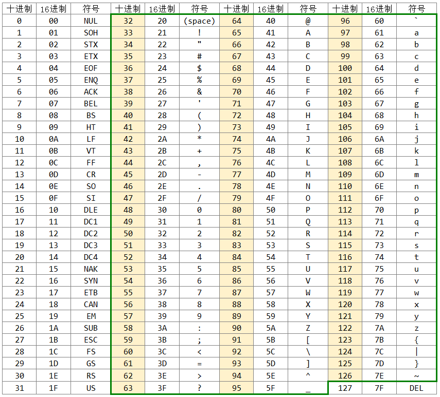 一个可打印的ASCII字符(参考图:在ASCII代码表中,绿色边框内的字符)