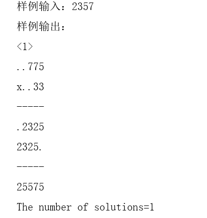 找出所有形如abc*de(三位数乘以两位数)的算式,使得在完整的竖式中,所有数字都属于一个特定的数字集合。输入数字集合(相邻数字之间没有空格),输出所有竖式。每个竖式前应有编号,之后应有一个空行。最后输出解的总数。具体格式见样例输出(为了便于观察,竖式中的空格改用小数点显示,但你的程序应该输出空格,而非小数点)。